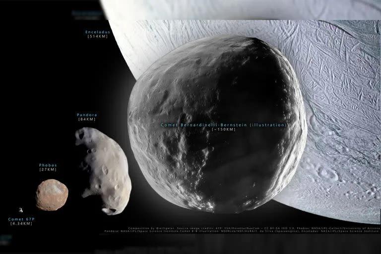 Los científicos y astrónomos Pedro Bernardinelli y Gary Bernstein, en colaboración con el observatorio Dark Energy Survey, realizaron el descubrimiento del ahora llamado Cometa Bernardinelli-Bernstein, un cuerpo celeste que tiene un tamaño de unos 160 kilómetros de diámetro, algo así como 10 veces un cometa normal o 7 veces el diámetro de Fobos, una de las Lunas de Marte.