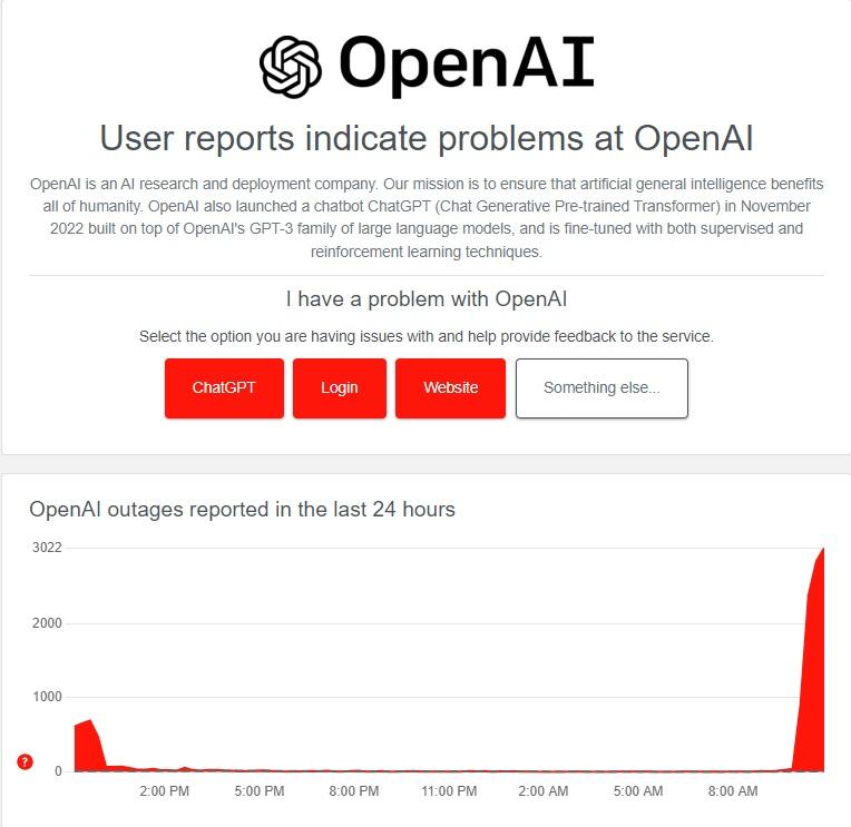 De momento, OpenAI, la empresa tras ChatGPT, no ha dado ninguna información al respecto, pero diversas páginas que detectan la caída de servicios web, como DownDetector.com, reconocen el problema.