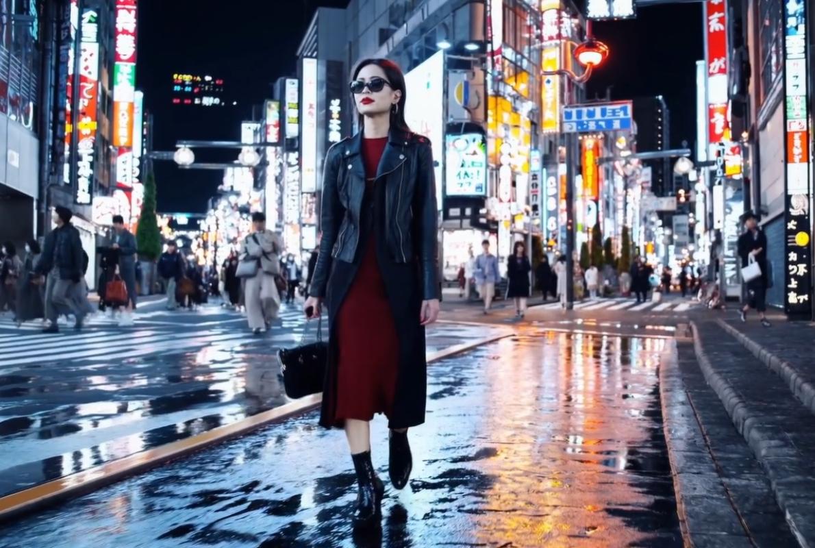 Este es el texto que OpenAI le pidió a Sora recrear en un video: "Una mujer con estilo camina por una calle de Tokio llena de cálidos neones brillantes y letreros animados de la ciudad. Lleva puesta una chaqueta de cuero negra, un vestido largo rojo y botas negras, y lleva un bolso negro. Usa gafas de sol y lápiz labial rojo. Camina con confianza y de manera relajada. La calle está húmeda y reflectante, creando un efecto espejo de las luces coloridas. Muchos peatones caminan por allí".