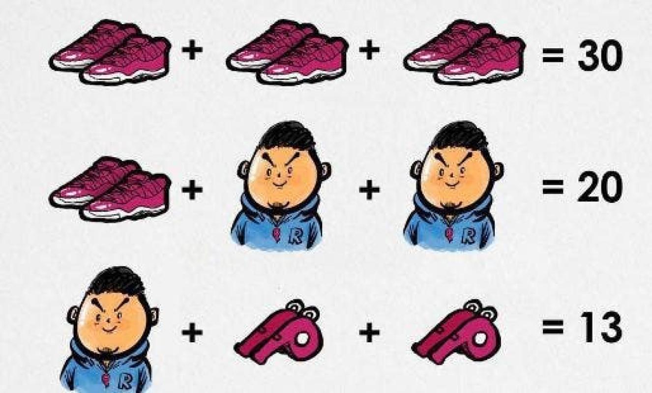 Para poder encontrar el resultado final, primero hay que establecer el valor de cada imagen. Siendo el par de zapatillas 10, el hombre con pito 5 y el par de pitos 4.
