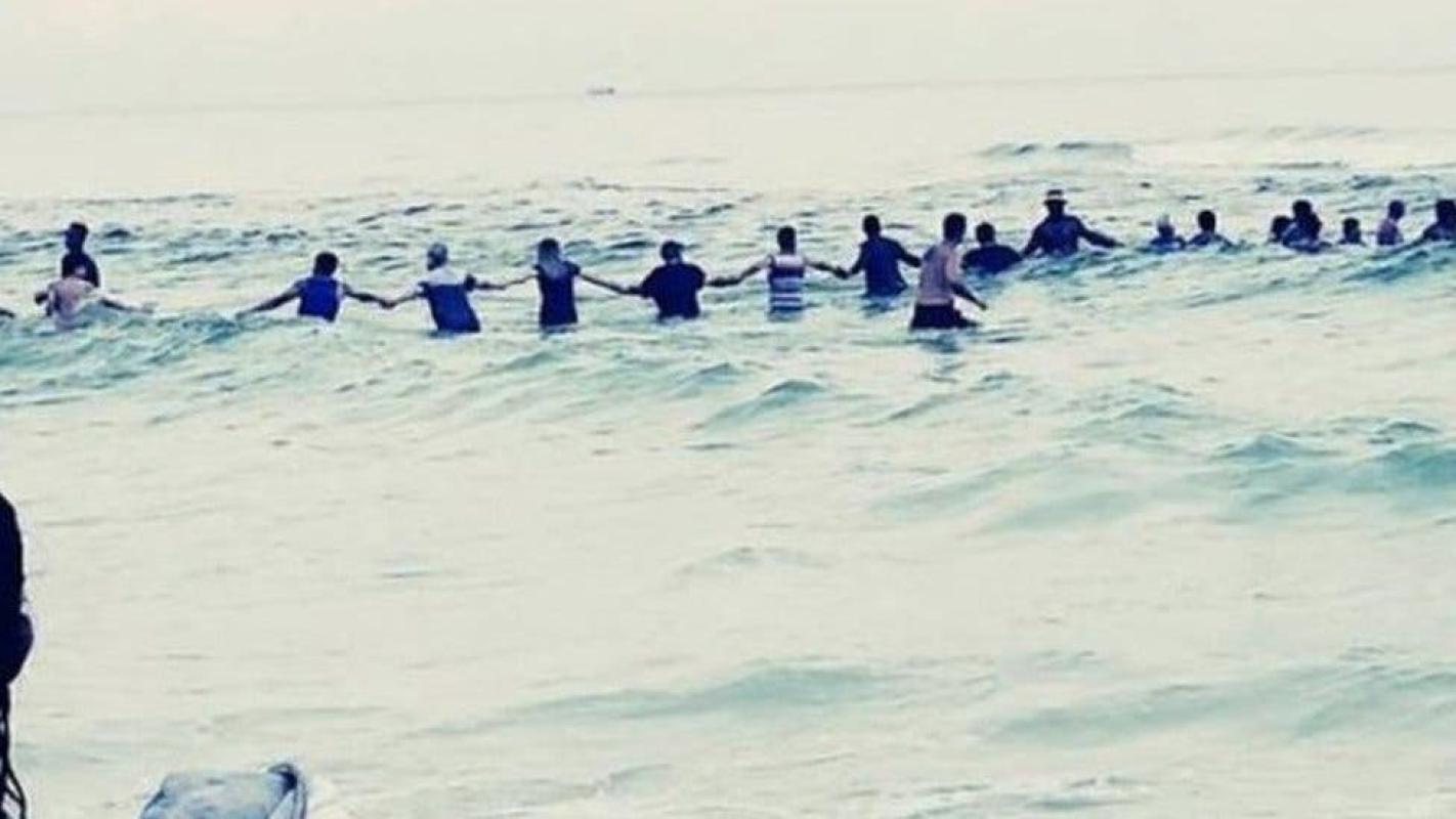 Jessica Simmons y su esposo, otros bañistas que estaban cerca, al ver lo que ocurría reaccionaron y con urgencia convocaron a las personas alrededor a que se tomaran de la mano para formar una cadena humana.