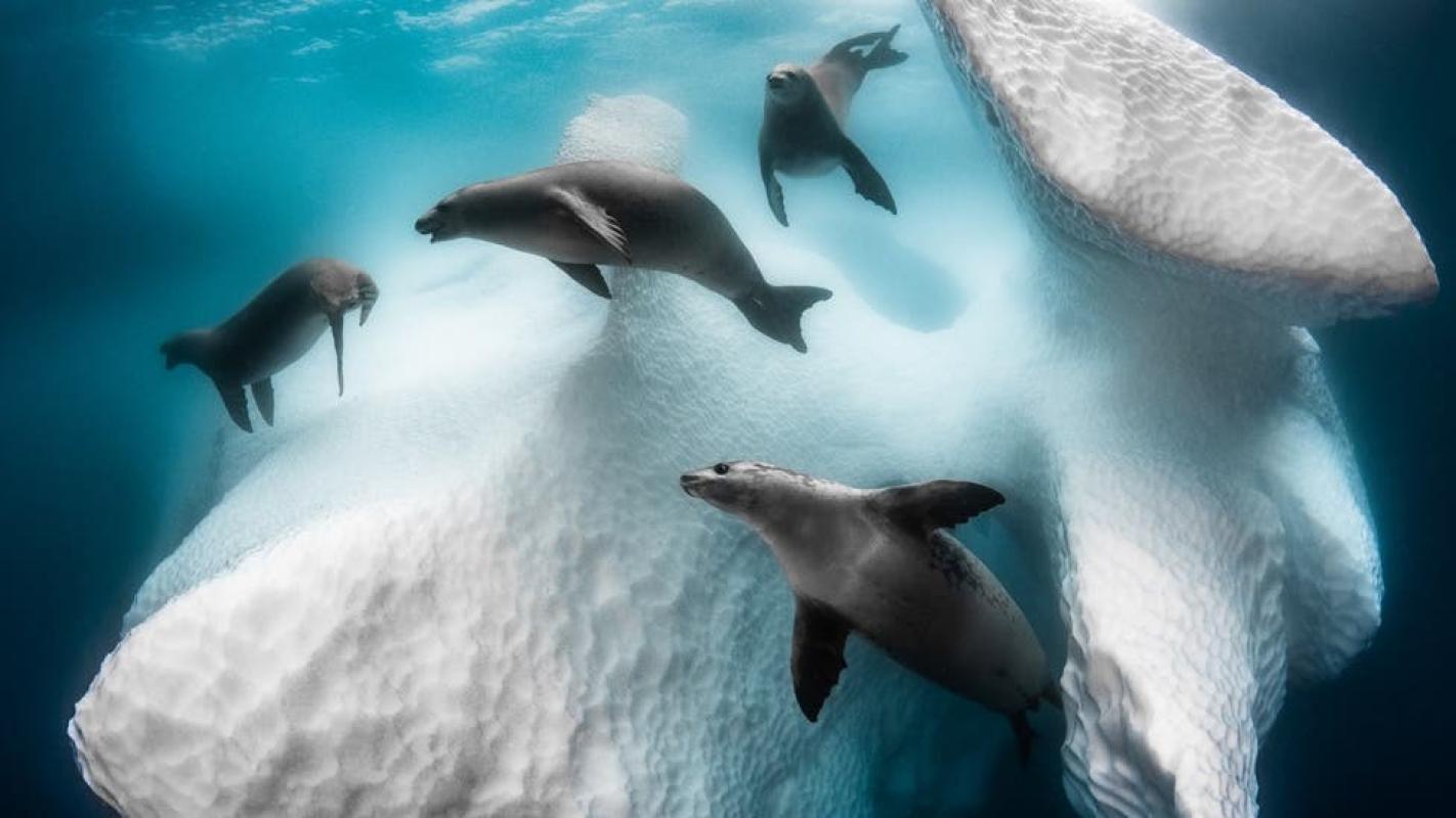 Greg Lecoeur ganó el cotizado premio Fotógrafo Submarino del Año 2020 con "Casa móvil congelada", que plasma a un grupo de focas nadando alrededor de un iceberg en Antártida.