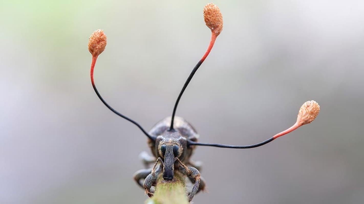 No es un singular embellecimiento de las antenas de un escarabajo, no. Se trata de un "hongo zombi" que ha tomado el control absoluto del insecto.
