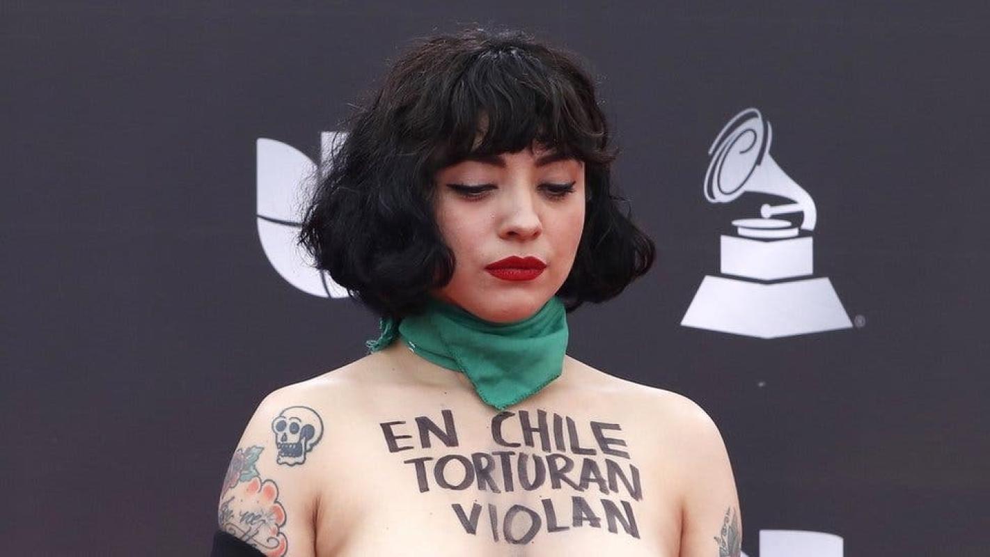 La cantante se convirtió este jueves en protagonista de la alfombra roja de los premios Latin Grammy que se entregan en Las Vegas al protestar con los senos al descubierto contra la represión de los manifestantes en Chile.