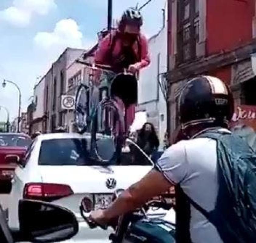 Ciclista pasa por arriba de un auto estacionado en un ciclovía en México