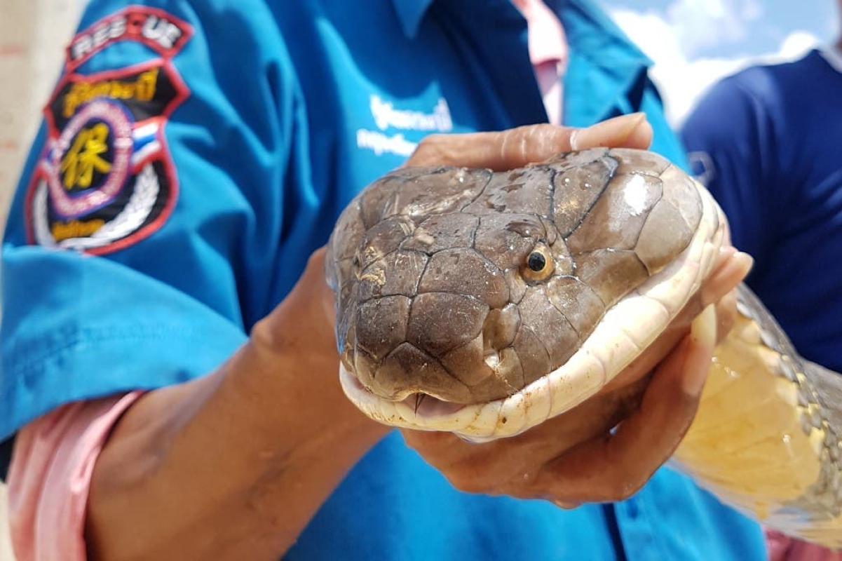 Una cobra rey de cuatro metros fue sacada de una alcantarilla en el sur de Tailandia en una operación de una hora, informó este martes una fundación de rescate, que describió al reptil como uno de los más grandes que han capturado.