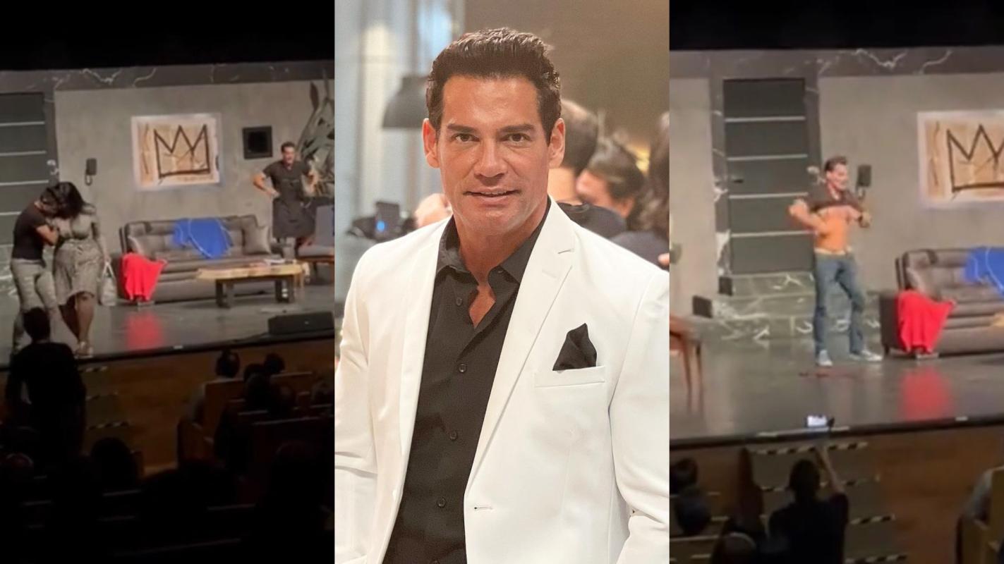 En el clip se ve el momento en que el actor aparece entre el público con el torso desnudo en un momento de la obra llamada 'Los amantes perfectos'. En ese instante los espectadores le lanzaron piropos y lo aplaudieron, pero cuando regresó al escenario y se colocó la camiseta, la mujer en cuestión lo siguió.