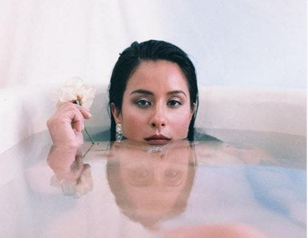En la instantánea aparece posando en una tina, cubierta de rosas blancas y completamente desnuda. Mientras se ve cómo una persona le toma la foto profesional.