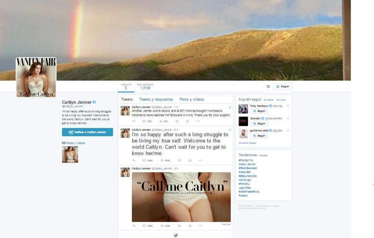 El ex atleta olímpico y patriarca de clan Kardashian, Caitlyn Jenner, como se autodenominó en la portada de junio de Vanity Fair, abrió su cuenta en la red social Twitter y a las 4 horas ya tenía 1 millón de seguidores.