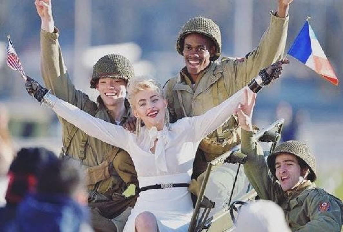A su cuenta de Instagram subió una imagen en la que se le ve junto a extras que simulaban ser soldados de la Segunda Guerra Mundial y ella sosteniendo en sus manos las banderas de Estados Unidos y Francia.