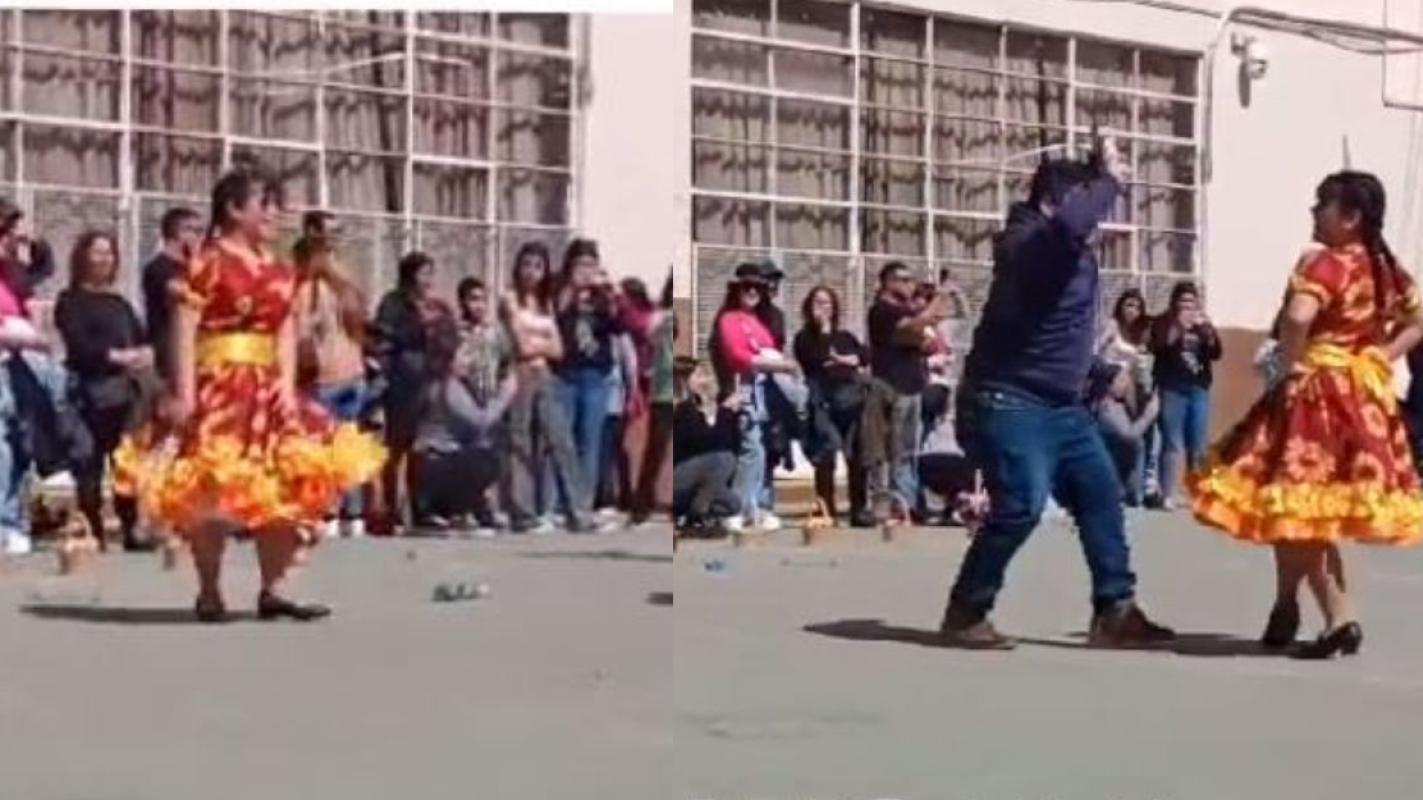 En el video viralizado en Tiktok se ve al hombre entrar al escenario para ponerse a bailar. Luego una profesora le pasa un pañuelo para que siga con la danza.
