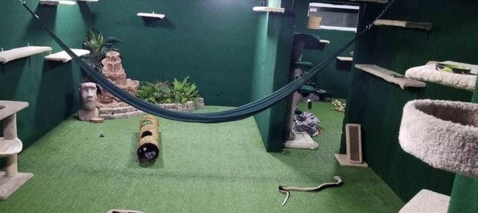 La idea era crear una jungla, por lo que las paredes -que los gatos pueden escalar fácilmente-, son verdes al igual que el piso.