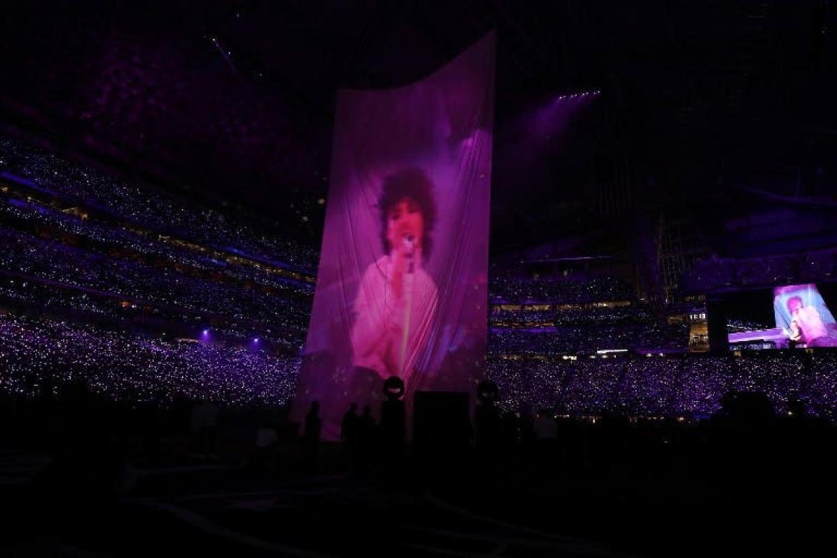 Mientras Timberlake disminuía el ritmo de una coqueta versión del éxito de Prince "I'd Die 4 U", imágenes de la era de Purple Rain eran proyectadas en el techo del nuevo estadio US Bank en medio de una neblina humeante, cerrando con la silueta de "The Purple One" (Aquel de Púrpura), como le decían a la difunta estrella, portando su guitarra.