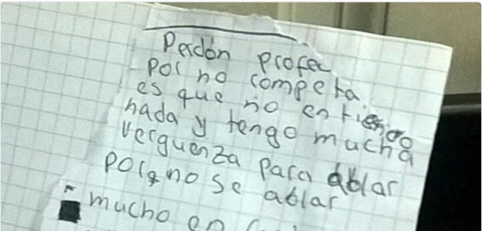 En el texto se puede leer: "Perdón profesor por no competar es que no entiendo nada y tengo mucha vergüenza para hablar porq no se ablar mucho en castellano solo en guaraní te pido una disculpa profe perdón. Espero que me entienda profe porque es muy difisil empezar de 0 en otro pais"