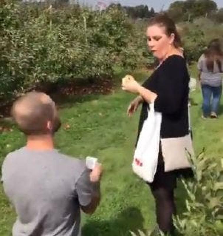 Esto fue lo que le ocurrió a una mujer que visitaba junto a su novio un campo de manzanas, donde repentinamente el novio abre una caja con el anillo y se arrodilla. Sin embargo, la novia no entiende muy bien la propuesta y le lanza una manzana que estaba comiendo en la cara.