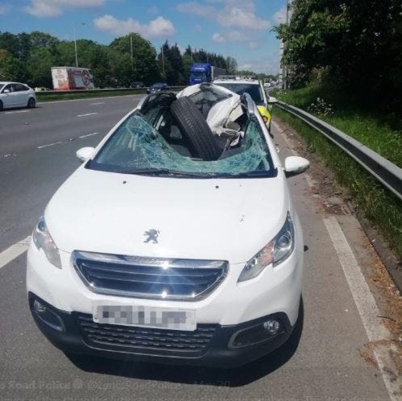 Un hombre se salvó milagrosamente cuando al ir conduciendo por Lancs Road -una carretera del Reino Unido que une Liverpool con Salford- sobrevivió al golpe de un neumático que cruzó la barrera que separa las dos vías, incrustándose fuertemente en su parabrisas.
