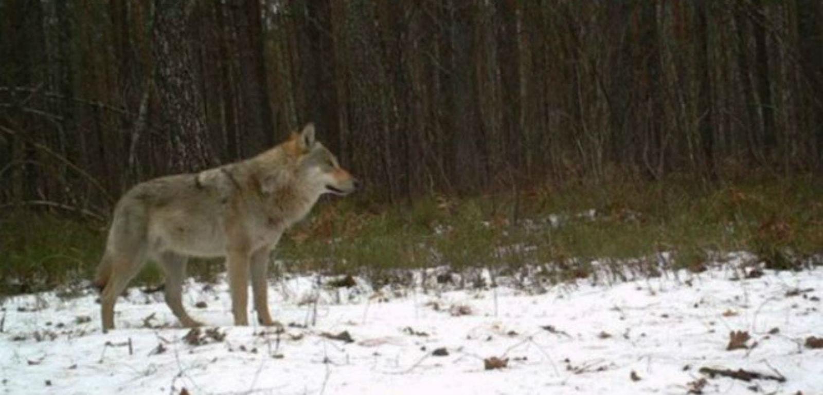 Un lobo gris solitario se toma unos segundos para observar alrededor. La imagen fue tomada por una de las cámaras automáticas instaladas en la zona de exclusión.
