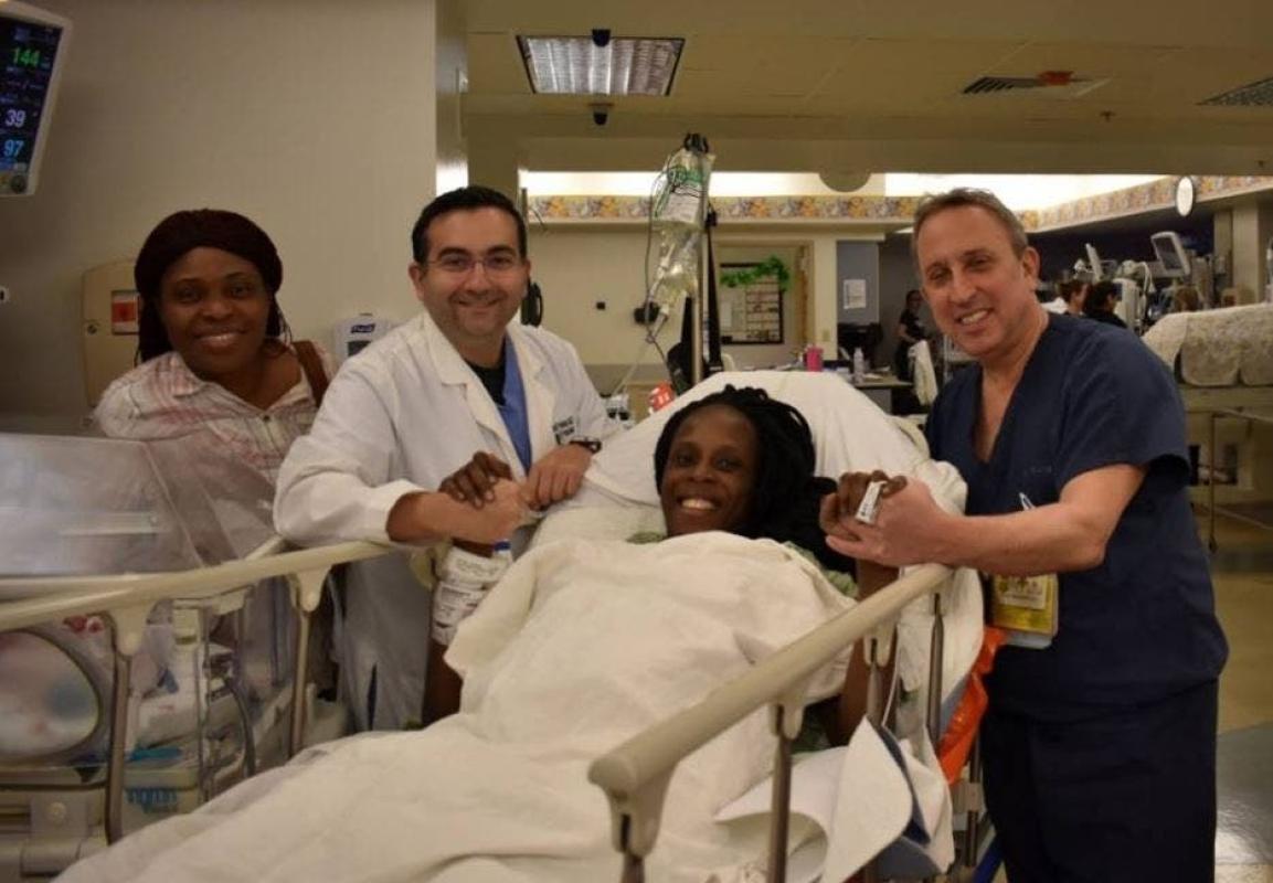 Una foto compartida por el hospital mostraba a Chiaka sonriente en la cama del hospital con un pariente, y tres médicos a su lado.