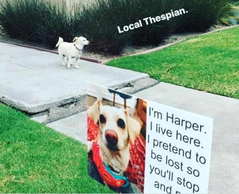 Fue mientras pensaba qué hacer que vio un enorme letrero, con una fotografía del perro, que llamaba a la calma y explicaba las intenciones del can: “Soy Harper. Yo vivo aquí. Finjo estar perdido, así que te detendrás y me acariciarás”.