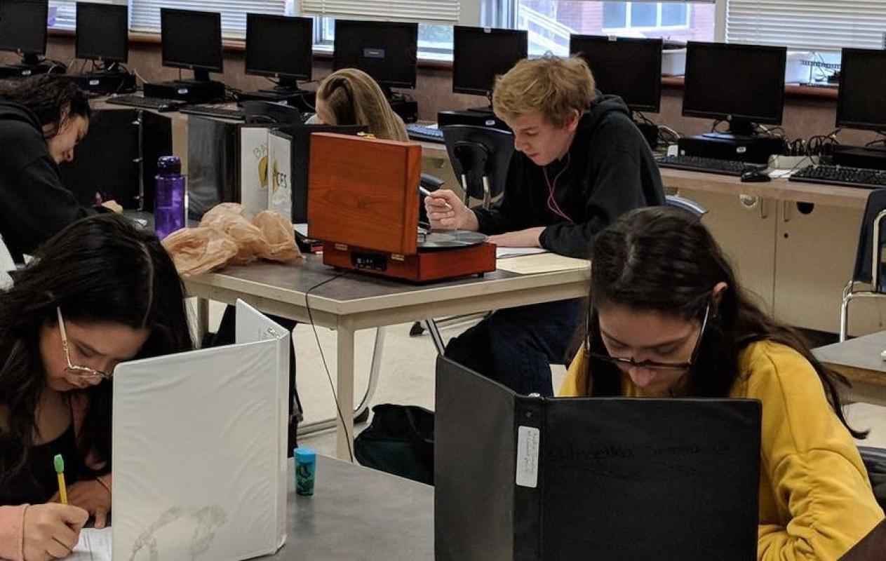 This student brought in a record player and is bumping Kanye in his headphones right now... pic.twitter.com/p57iMIal7D