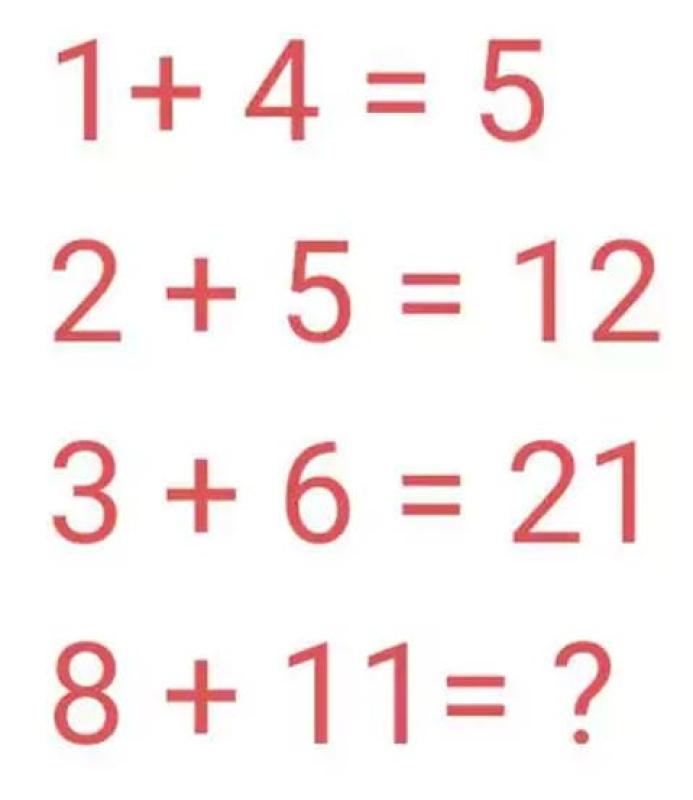 La segunda posibilidad, más sofisticada, es tomando el signo + como de multiplicación y sumando al resultado la primera cifra de la cuenta. Así, en la primera cuenta hay que sumar 1 a 1 x 4; en la segunda línea hay que sumar 2 a 2 x 5; en la tercera hay que sumar 3 a 3 x 6 y en la última hay que sumar 8 a 8 x 11, lo que daría un resultado de 96.