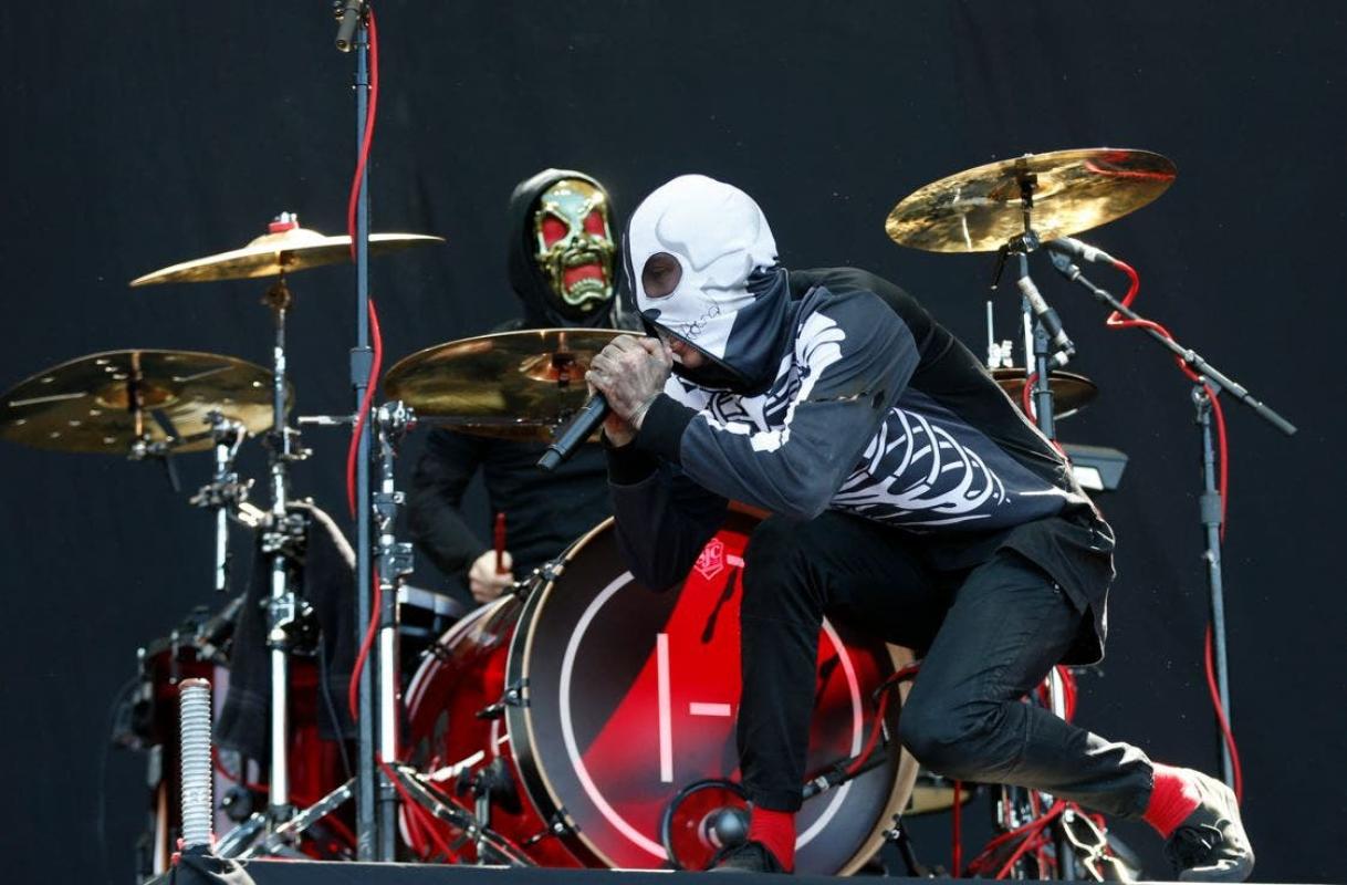 "Heavydirtysoul" fue el primer virus que se expandió sobre la explanada, con el vocalista Tyler Joseph cantando bajo un micrófono que cae desde el techo y el baterista Josh Dun marcando los tiempos de un proyecto improbable.