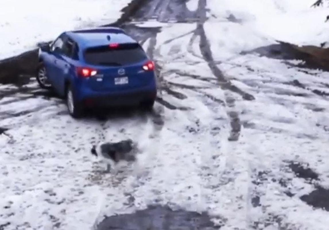 Todo comenzó cuando el perrito vio al perro grande y corrió hacia él. Sin embargo, no se percató que su dueña estaba retrocediendo con su vehículo, quien tampoco se dio cuenta que su mascota estaba atrás.