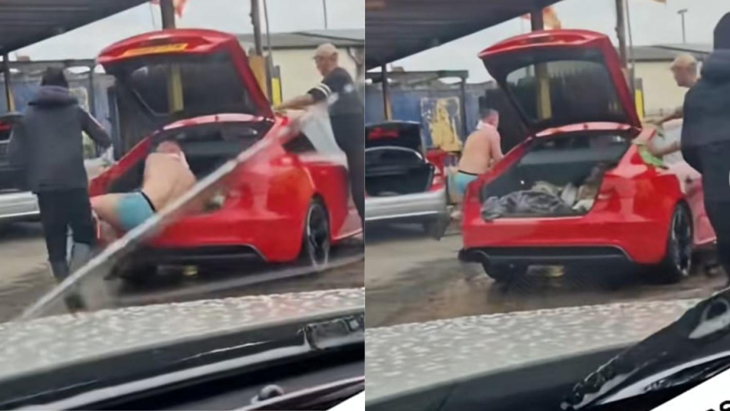 El video fue publicado en TikTok y se puede ver a un empleado del lavado de autos abriendo la parte trasera del auto mientras un hombre semidesnudo sale corriendo.
