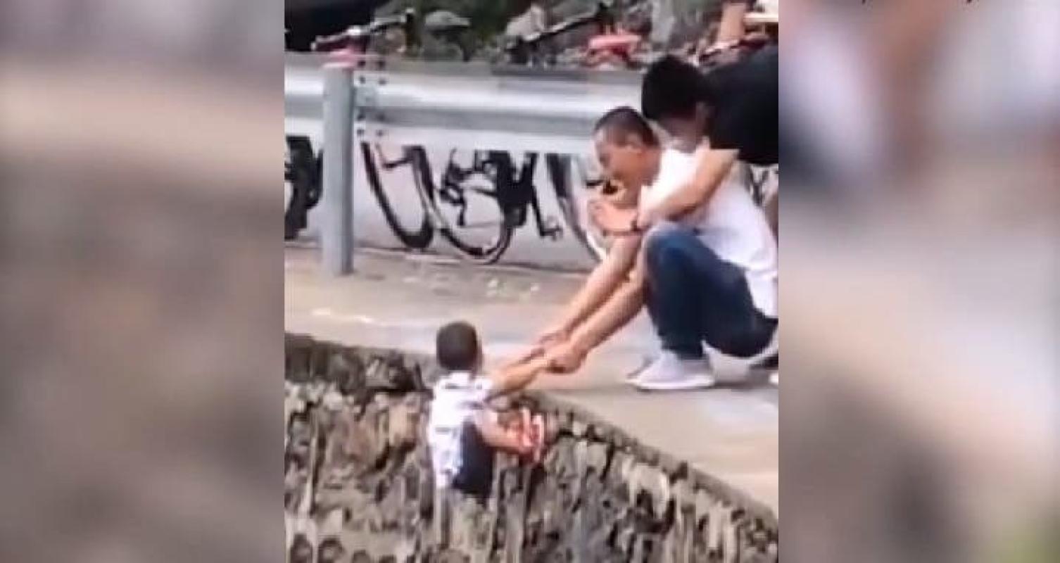 Todo por una foto: padre es captado colgando a su hijo de un abismo en China