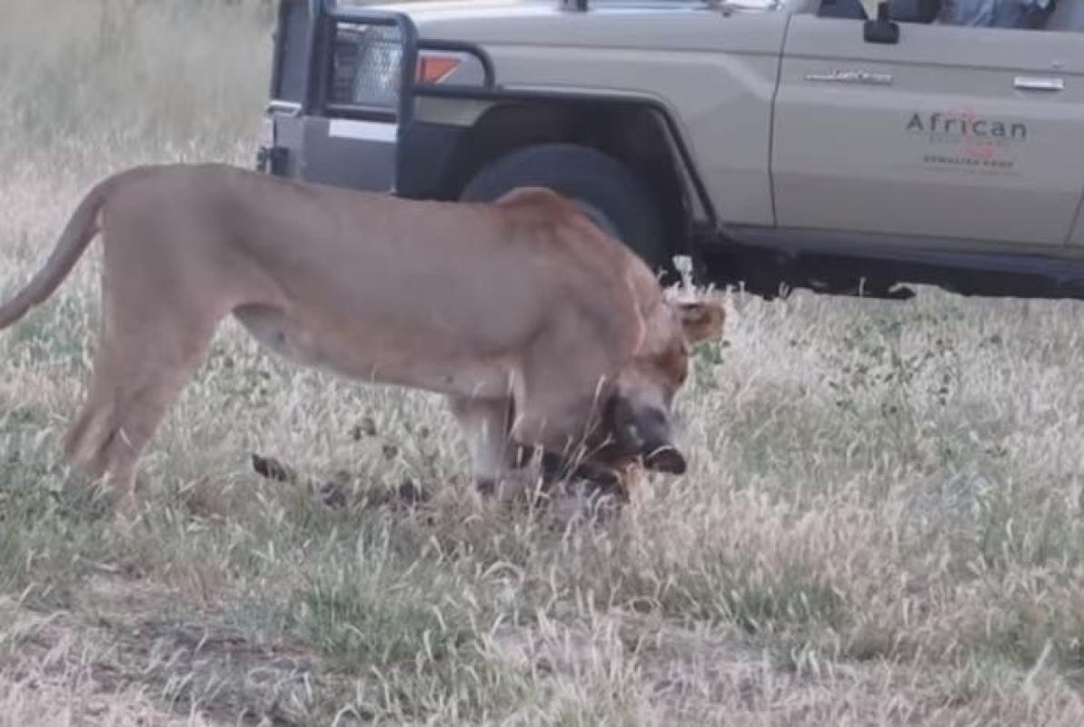 El perro salvaje, también conocido como Licaón, al verse atrapado en las fauces del felino comenzó una gran actuación, simulando estar muerto durante largos minutos, mientras la leona se paseaba con él, arrastrándolo.