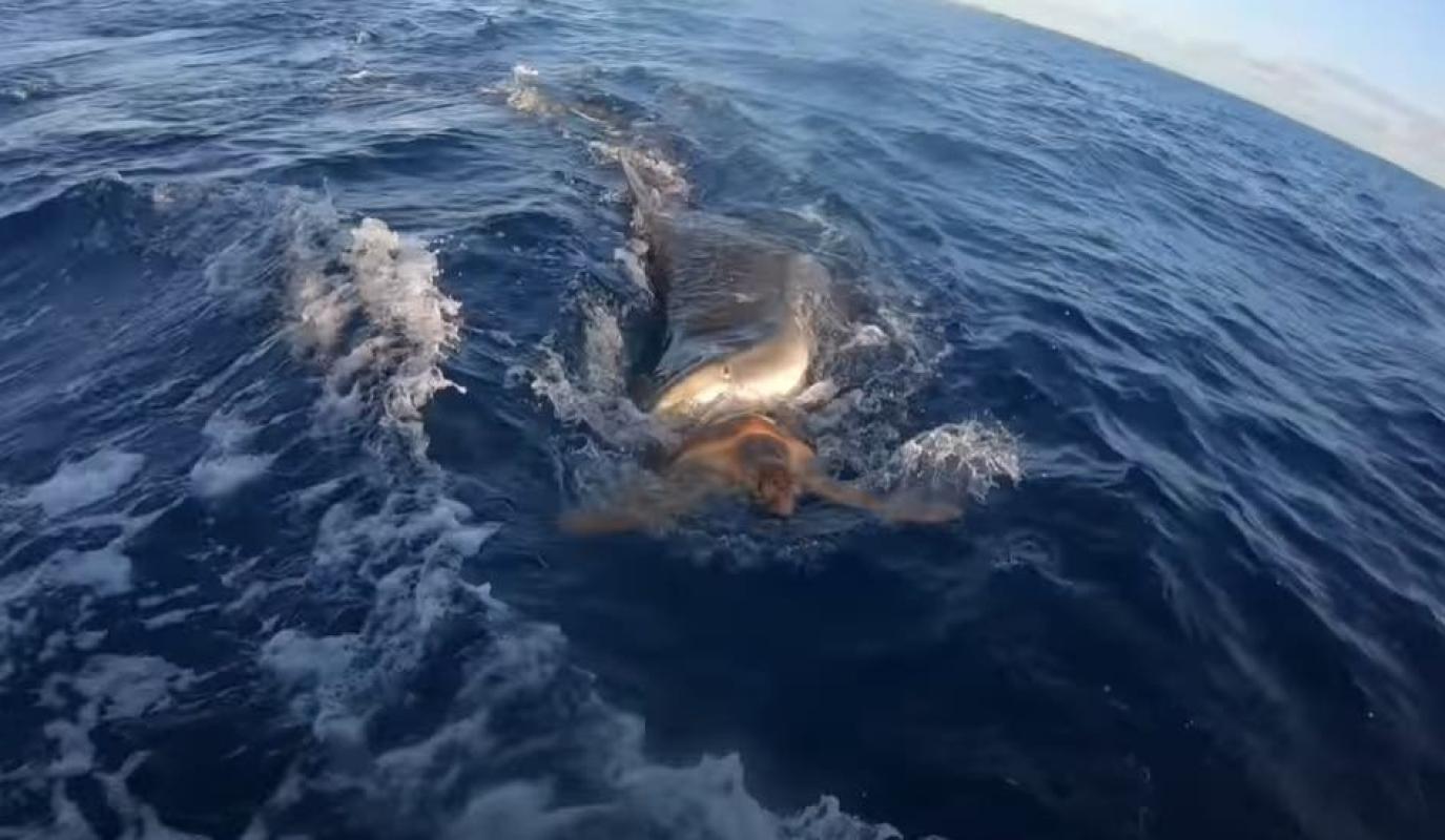 En la grabación se ve cuando los jóvenes divisan una tortuga que estaba siendo mordida por un tiburón tigre pero no lograba penetrar el duro caparazón del reptil.