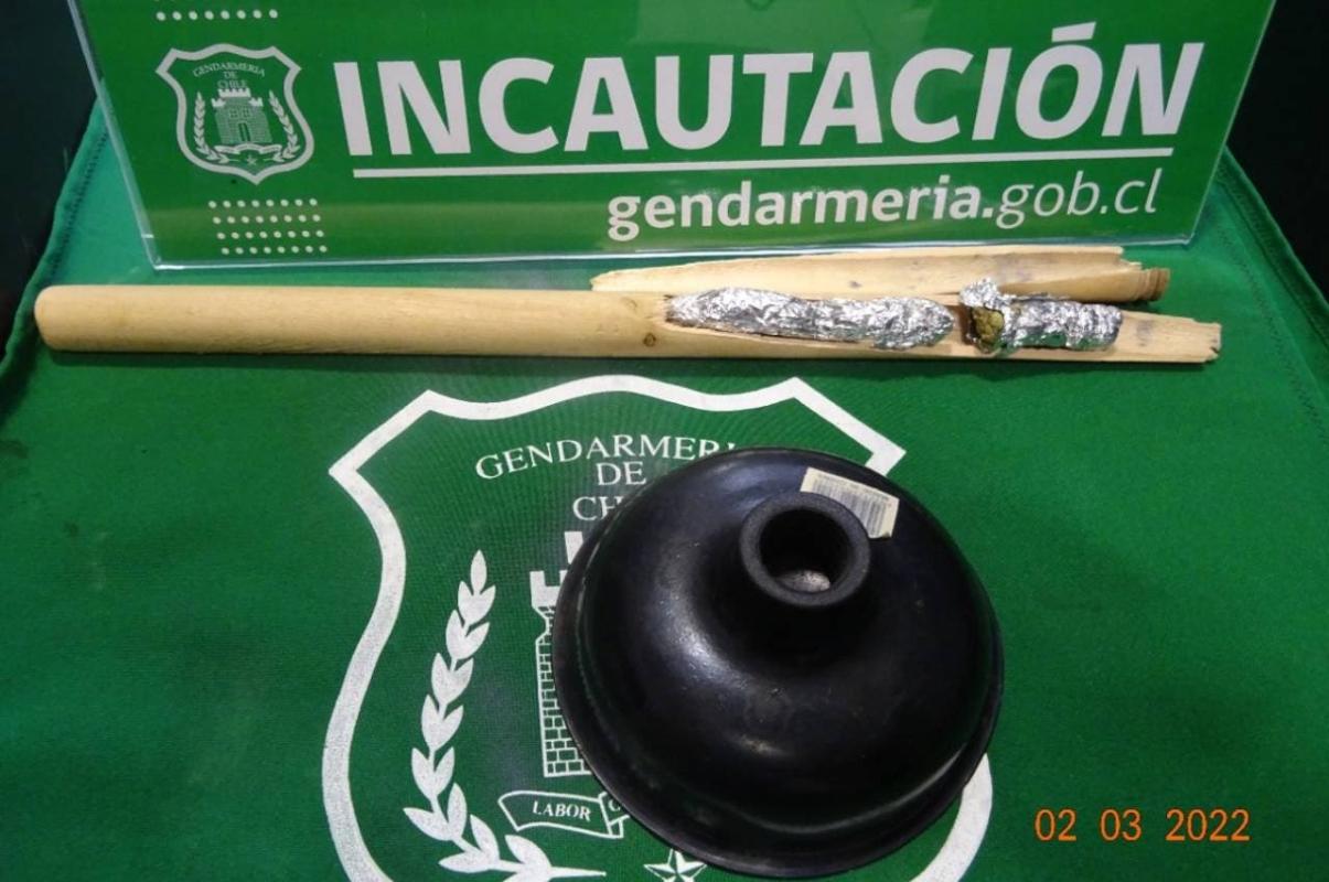 Tras ser pasados los artículos por rayos X, los funcionarios descubrieron que al interior del mango del sopapo habían envoltorios y al romperlo se percataron que contenían marihuana enrollada en papel de aluminio.