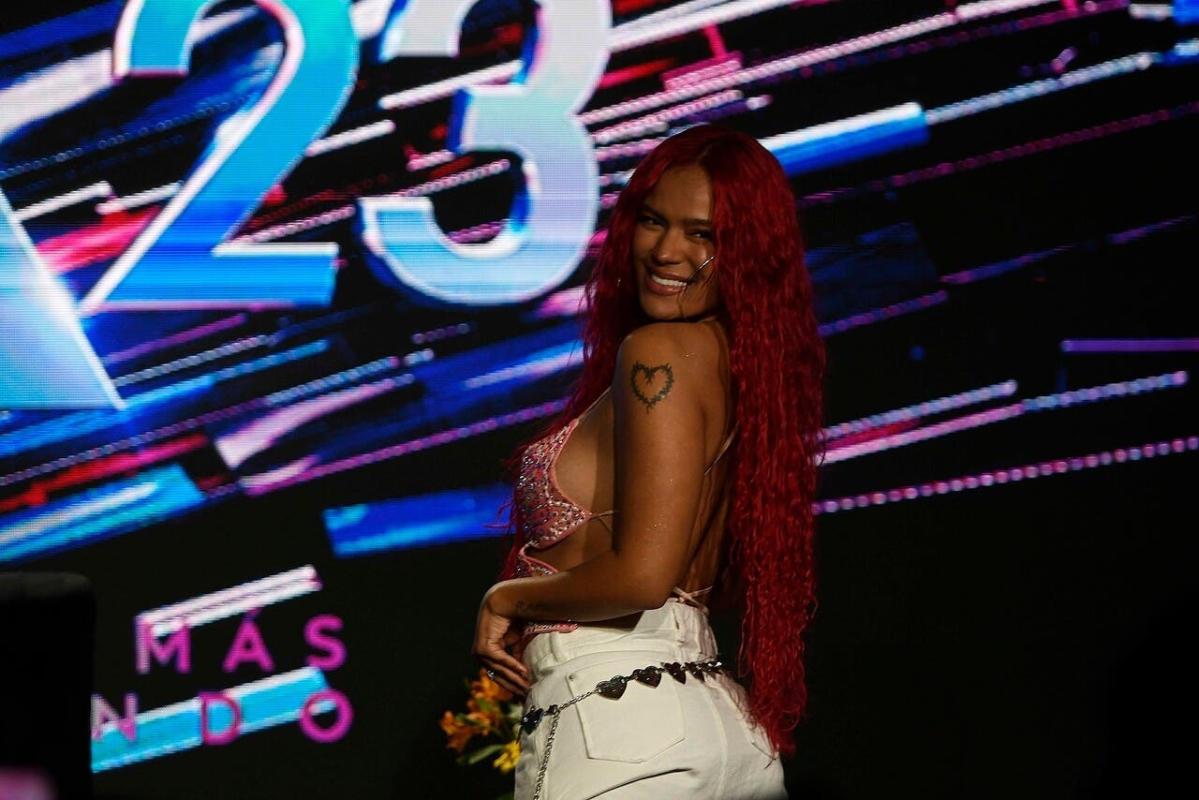 La cantante colombiana Karol G dio su conferencia de prensa este domingo en el Hotel Sheraton previa a su presentación este domingo en el Festival de Viña del Mar 2023.