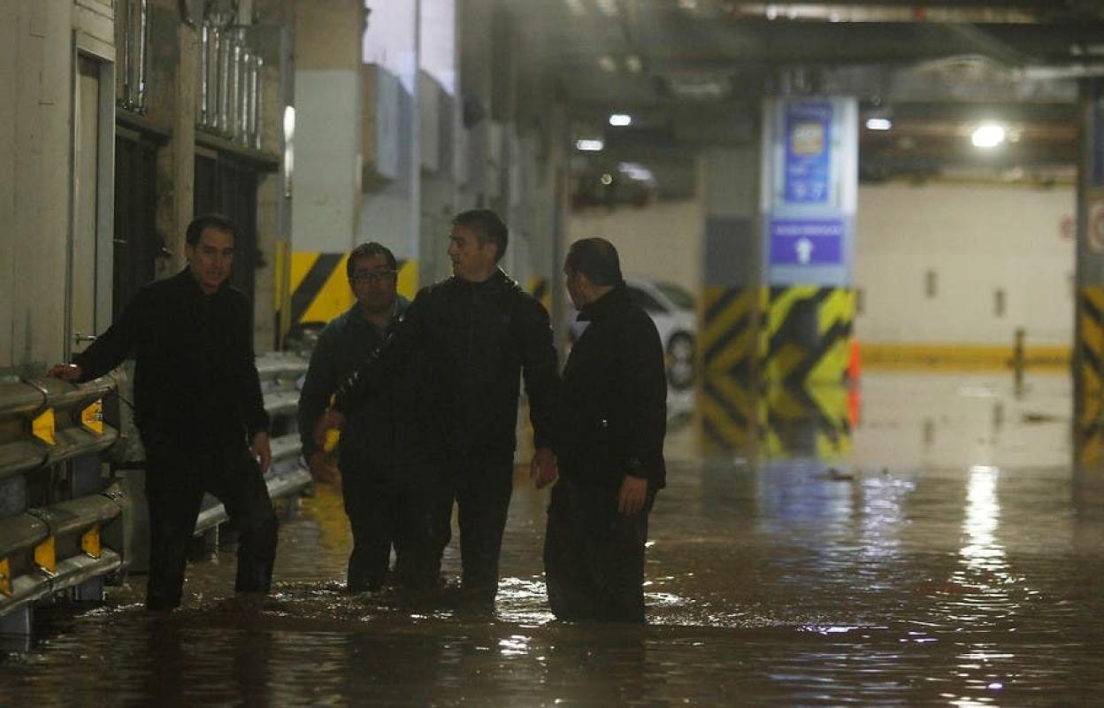 Cabe recordar que ayer los estacionamientos del centro comercial se inundaron debido a que las aguas del río Mapocho desviaron su cauce debido a las obras que realiza Costanera Norte en la rotonda Perez-Zujovic.