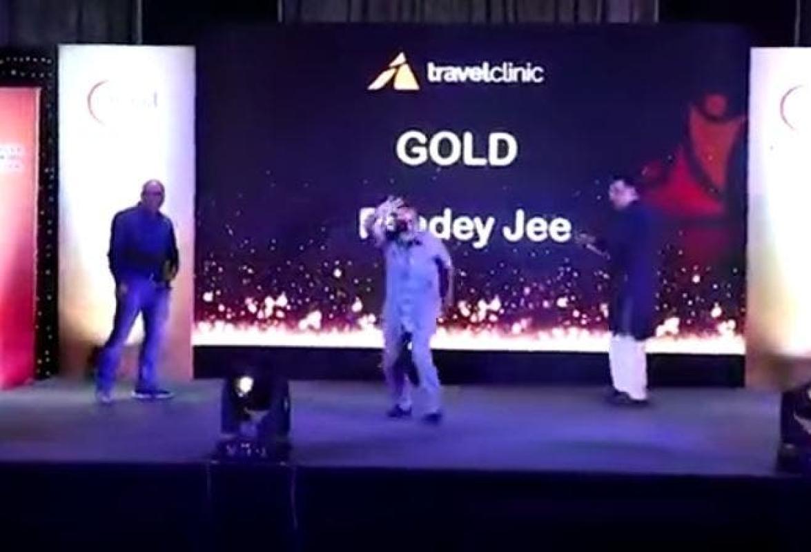 Vishnu Paney de 53 años se subió a recibir un galardón obtenido durante un evento realizado por una agencia de viajes en la ciudad india de Agra. Al momento llegar al escenario se puso a bailar, momento en que sufrió un paro cardíaco fulminante. Falleció minutos después cuando era trasladado al hospital.