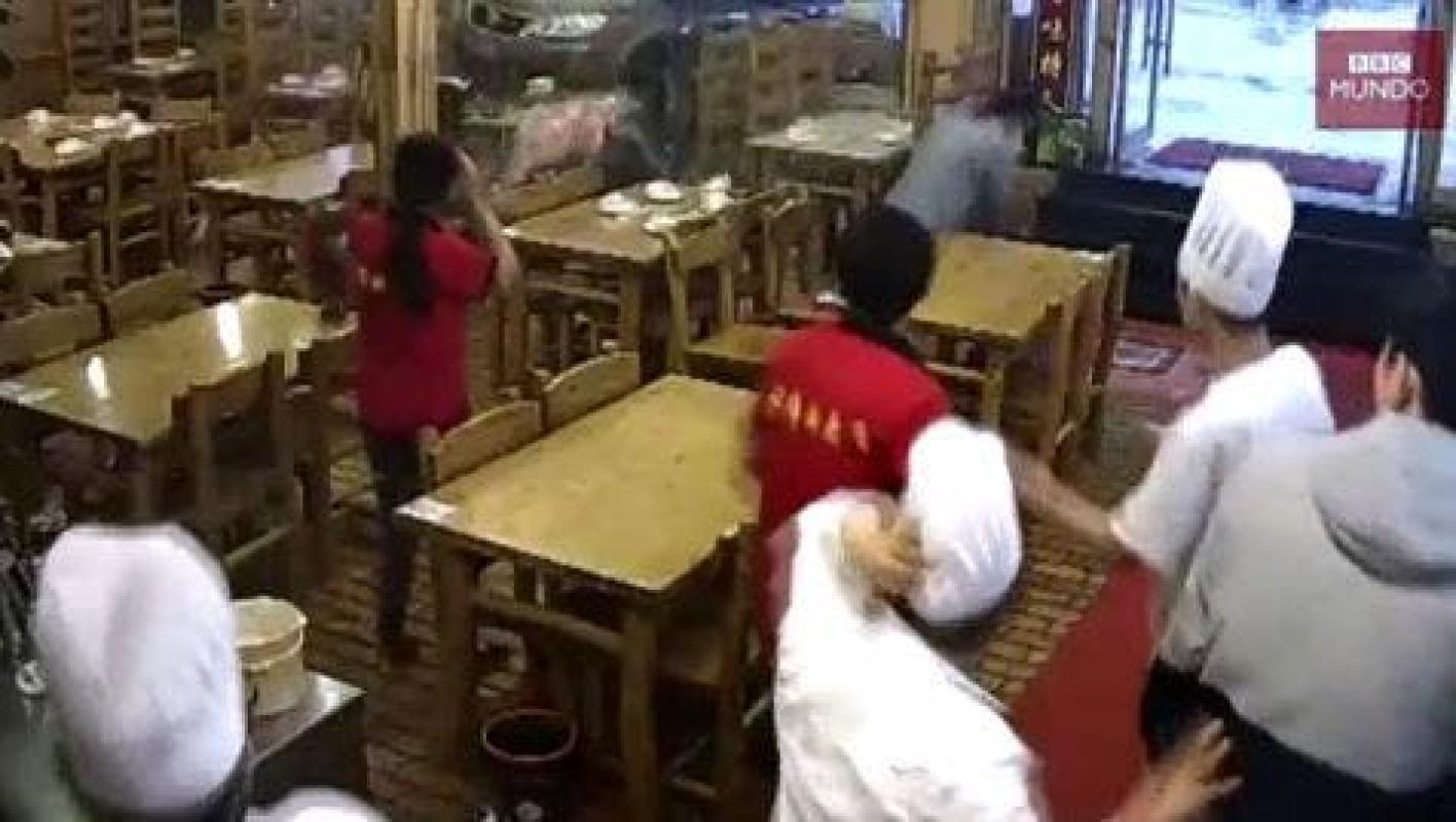 Un susto se llevaron cuatro jóvenes que cenaban en un restaurante en Shanghái, China, cuando un auto se estrelló contra el lugar cuando intentaba estacionarse.