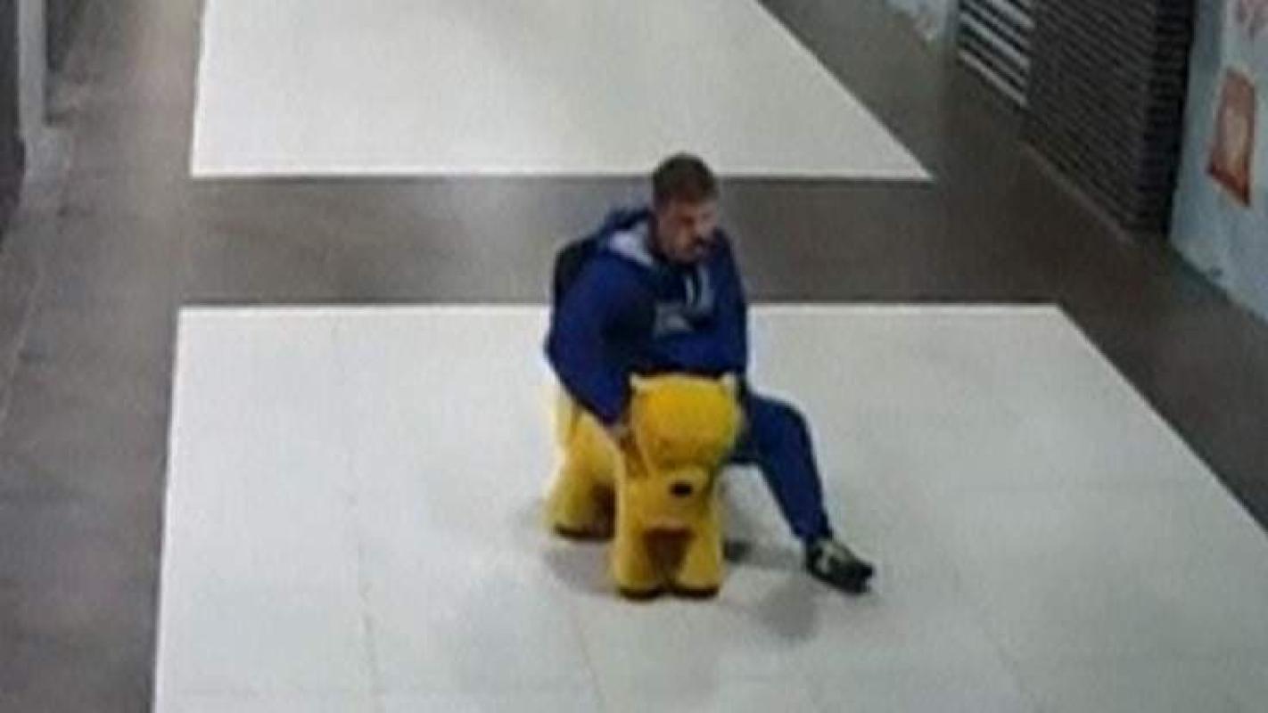 Durante el robo, se ve al sujeto vestido de azul escapando tranquilamente, puesto que al parecer a nadie le parece sospechoso que salga del centro comercial sobre un coche de juguete.