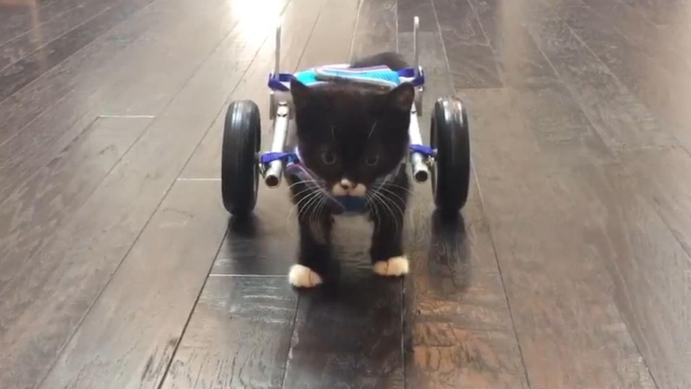 [VIDEO] Gato sin dos patas traseras logra caminar gracias a pequeña silla de ruedas