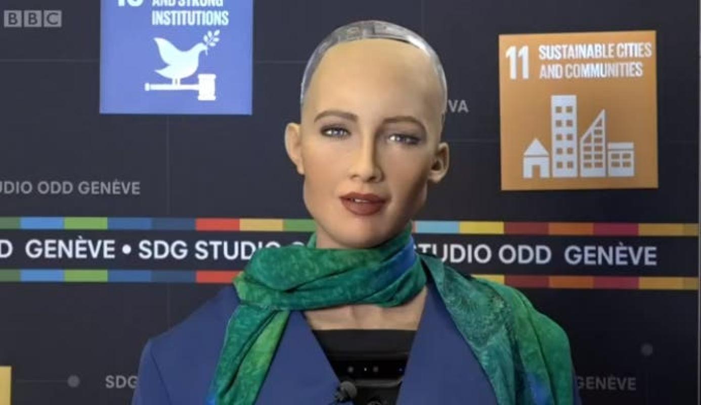 Es de esperarse pues es una sofisticada robot humanoide creada por la empresa Hanson Robotic que se ha vuelto la sensación de una conferencia en Ginebra sobre robótica auspiciada por la ONU.